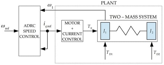 The two-mass object is a popular control object in drive automation [40,41,42], since it reflects the characteristics of typical connections found in the mind. The block diagram of the dual-mass system is shown in Figure 2. The description intentionally omits the loss factor inside the connection, as it is generally negligible.