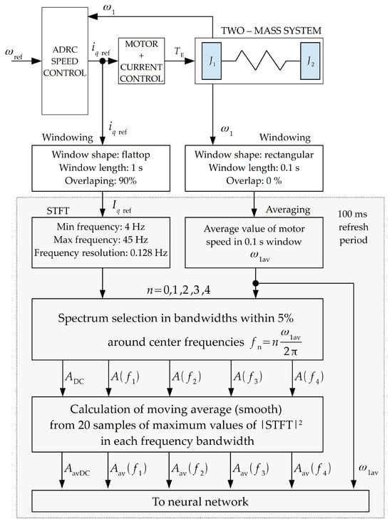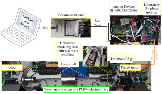 The object of the research was a two-mass drive system consisting of two permanent magnet synchronous motors with three pairs of poles, a rated power of 3 kW, and a rotational speed of 3000 rpm. The motors were connected to each other by a long shaft with a diameter of 6 mm. A disc was mounted on the drive side, to which a test mass was mounted at a radius of 42 mm. The drive system was attached to a concrete foundation, the purpose of which was to reduce the vibrations that occur during the operation. During the research, the set current Iq ref and the angular speed of the motor ωmotor were recorded using the NI USB-9162 card with a sampling frequency of 12.8 kS/s. Signals were measured for 10 s. The Iq ref current was generated from the vector control system implemented (Figure 5) in the Analog Devices SHARC DSP 26369 signal processor.