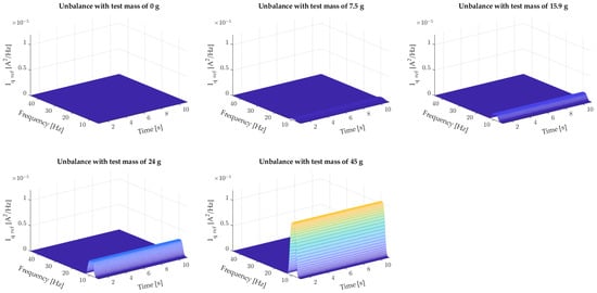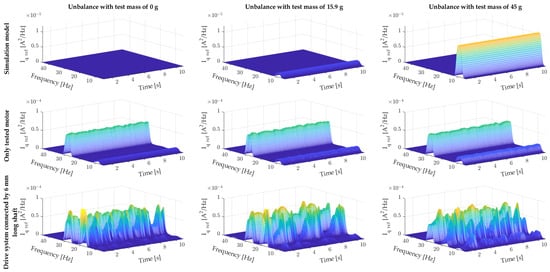 The purpose of the simulation studies was to confirm the diagnostic symptoms indicative of rotor unbalance occurring in the reference current Iq ref. During these studies, the same masses that were also used during laboratory tests were used to model the unbalance. The effect of the test mass on the Iq ref current is shown in Figure 6, from which it can be seen that the additional test mass increases the amplitude of the rotational frequency fr. Apart from the rotational frequency, there are no additional harmonics in the Iq ref current spectrum up to 45 Hz. Moreover, with simulation time, the value of the rotational frequency amplitude does not change. The restriction of the band to 45 Hz is due to the fact that a symptom of rotor unbalance is an increase in rotational frequency amplitude. In the case of the modelled motor, the set speed was about 60 rad/s, which is equivalent to a frequency fr of about 9.6 Hz. The set spectrogram range allows observing up to a fourth multiple of the rotational frequency.