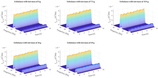 From the summary shown in Figure 7, it can be seen that in the case of tests performed on a real motor, in addition to the visible changes in the amplitude of the rotational frequency fr, the current spectrogram Iq ref also includes a 3fr component. Increasing the test mass causes only an increase in the amplitude of the fr frequency, the value of which assumes an approximately constant value during operation. Increasing the unbalance level does not change the amplitude of the 3fr frequency, which assumes an approximately constant value of about 60 μA2/Hz with slight oscillations.
