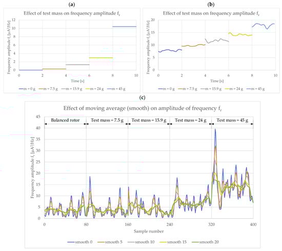 Summary of fr frequency amplitudes for different values of test weight: (a) simulation tests, (b) experimental tests of a single-mass system, and (c) experimental tests of a two-mass system for different values of smoothing filter.