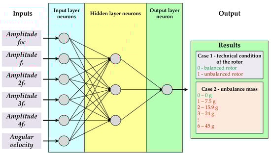 A unidirectional MLP neural network was used to detect the unbalance of the two-mass system and classify its level. MLP networks are characterised by a layered structure (Figure 11). Neurons in a layer are not connected to each other, moreover, the hidden layers and the output layer have no direct connection to external signals. In the input and output layers, the neuron activation functions are linear, while the hidden layer uses hyperbolic tangent-type functions. The neuron output signal of the MLP network is described by the following Equations (8) and (9) [54,55]: