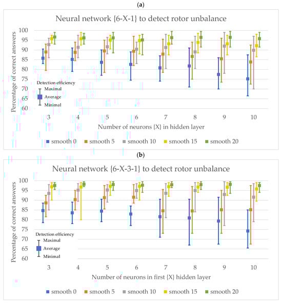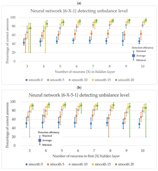 The task of the first neural networks was to detect rotor unbalance. Both networks with one hidden layer (Figure 12a) and with two (Figure 12b) were tested. In the case of networks with one hidden layer, the number of neurons in the hidden layer was changed from three to ten. The tests showed that from structures containing six neurons in the hidden layer, a decrease in the average efficiency of rotor unbalance detection is observed. In addition, from about five neurons in the hidden layer, large deviations of the minimum and maximum detection efficiency from the average value of 20 training and testing series are observed. This may be indicative of the increasing adaptation to the training vector. Figure 12a also shows a clear increase in average detection efficiency as the number of samples subjected to smooth filtering increases. Based on the study, it can be concluded that a neural network with a structure of 6-4-1 can be used to detect rotor unbalance in a two-mass system, with an average efficiency of about 96% using a moving average of 20 samples.