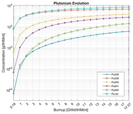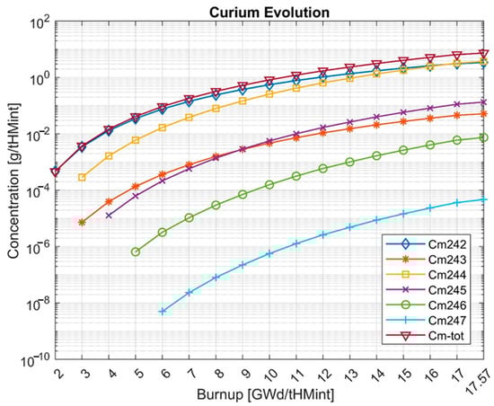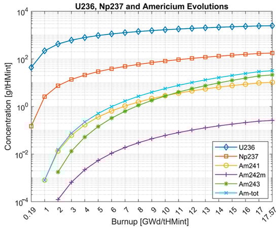- The concentrations of the transuranic isotopes were all monotonically increasing and had not yet reached equilibrium in the 17.571 GWd/tHMint of burnup.