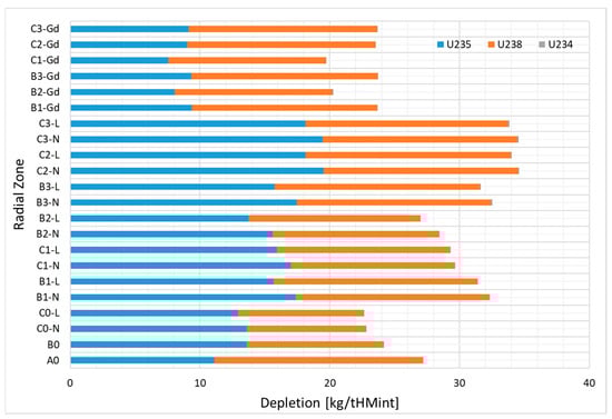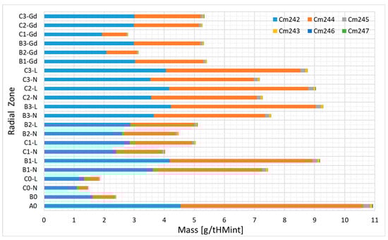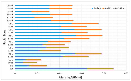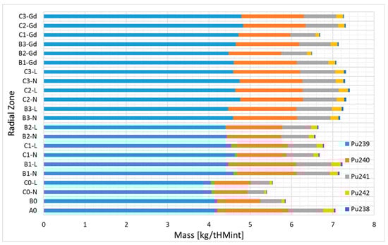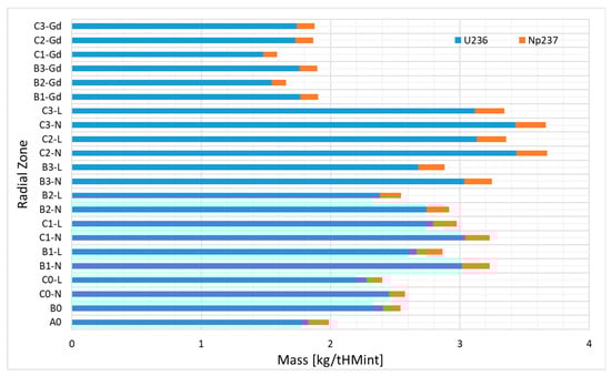 - The radial distribution of actinides varies by the isotope and depends on the fuel enrichment in 235U, the content of gadolinia burnable absorber, and the geometrical location of the burnup zones in the core.