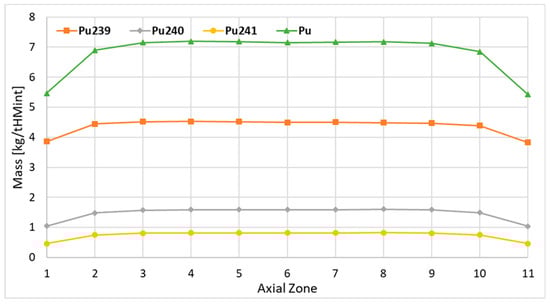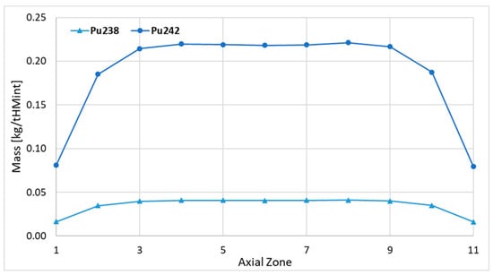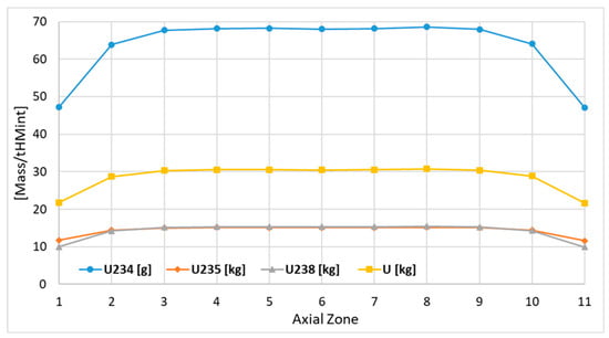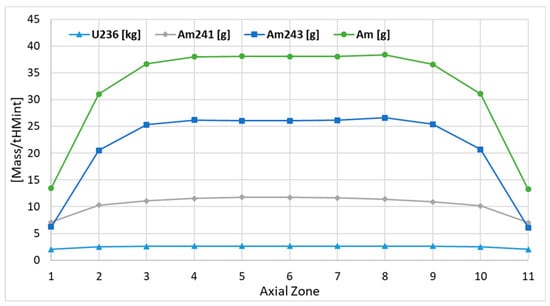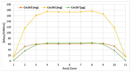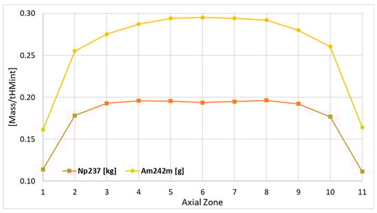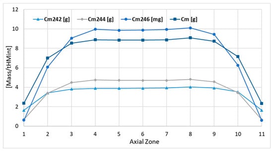 - The axial distribution of actinides at the EOC depends on total neutron fluence; the lowest concentrations were obtained close to the top and bottom reflector, and the highest in the burnup zones near the core center (zones 4 and 8).