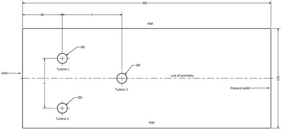 For this work, a triangular array was considered, consisting of three rotors, similar to the studies [26,29], which report various advantages of this type of triangular configuration, also known as the TriFrame. In this configuration, two rotors interact with the fluid current simultaneously, and a third rotor is located downstream. This arrangement aims to limit interference from the wake generated by the first two rotors. A coordinate system was established to represent design variables, as seen in the schematic of Figure 2. The distance between the channel edges and the rotors was determined according to the study reported by [27] and was considered in the computational domain for numerical simulations.