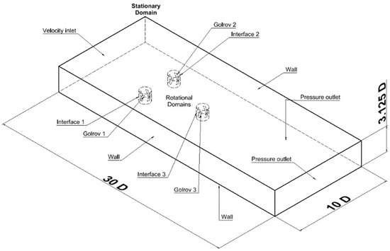 The process of numerical simulation begins by modeling the computational domain. For this, dimensional characteristics used in various related studies were considered [34,35]. Subsequently, a 3D computational domain was created in CAD software to simulate the nine treatments or experimental units resulting from the DOE. The computational domain consisted of two bodies. The first body represented the flow away from and external to the rotors, similar to a water channel, referred to as the stationary domain. The second type of body consisted of a cylinder enclosing each of the three rotors, referred to as the rotational domain, which is dynamic. Boundary conditions were assigned, including velocity inlets, outlet pressure, walls, and interfaces. The computational domain model is shown in Figure 3.