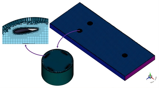 Once the computational domain was determined and modeled, meshing was performed. Since it is a 3D computational domain composed of two types of bodies, it was decided to separate each body and create a mesh for each. This meshing process was carried out using the Fluent-Meshing tool in the ANSYS software 2021 R1. The mesh used was a combination of an unstructured polyhedral type near the hydrofoil and a poly-hexcore type further away from the blades. According to various authors, polyhedral meshes have the advantage of facilitating the use of unstructured meshes near walls with complex geometries. Furthermore, their use considerably reduces the number of elements, thus decreasing computation time and notably improving convergence [36,37].