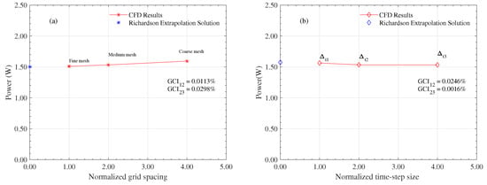 Mesh independence and temporal independence were assessed to ensure that the results obtained with different meshes did not significantly deviate from each other. The optimal mesh size was determined using the Grid Convergence Index () method, which is based on Richardson extrapolation and provides an estimate of the exact solution [46]. The power of the entire array (P), defined as the sum of the power generated by each rotor, was the standard of measurement for analyzing the variation in simulation results. The number of elements used for mesh independence testing was divided into three cases: fine mesh, medium mesh, and coarse mesh, with 8.9, 4.4, and 2.2 million elements, respectively. A temporal independence study was also conducted to determine the most suitable time step for simulations. Time steps of 0.002, 0.005, and 0.008 s were used for this test. Figure 5 represents the results obtained for the independence tests and Richardson extrapolation solutions. After the Richardson extrapolation analysis, the medium mesh and a time step of 0.008 s were selected. These choices exhibited deviations close to 2% for the Richardson extrapolation solution and reduced the computation time.