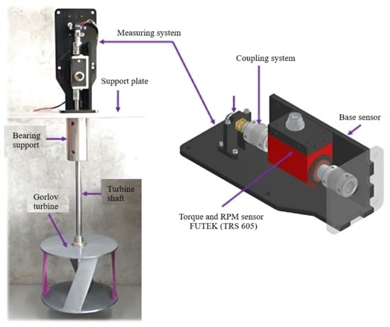 Once the scale models of the turbines and the structure shaping the hydrokinetic array were manufactured, the experimental setup was constructed to obtain the performance characteristic curves of each of the rotors operating together. The experimental testing system consisted of five components: the measurement system, the mounting plate, the bearing support, the shaft, and the rotor or turbine, as shown in Figure 8. The measurement system includes a torque sensor, a DC motor, mechanical couplings, and a support base. The torque sensor from FUTEK (TRS 605-FSH02052) has a measurement range of 0–1 Nm and is equipped with an encoder for measuring the rotational speed of the shaft. The second component of this system is a six VDC electric motor reducer, which primarily provides the electrical load on the turbine and acts as a brake. To measure the torque generated by the turbine at different rotational speeds (different TSR), a braking system was coupled to one end of the torque sensor. This system uses the six VDC motor reducer rotating in the opposite direction of the turbine, thereby generating a counteracting torque that reduces the turbine’s rotation speed. The braking torque is adjusted by the amount of current flowing to the DC motor through pulse width modulation (PWM), which is achieved using a microcontroller (Arduino Nano) and a power coupling circuit in the developed system. When it is necessary to decrease (or increase) the turbine’s rotation speed, the microcontroller increases (or decreases) the duty cycle of the PWM (i.e., modifies the pulse width), which increases (or decreases) the energy received by the motor, and consequently, the braking torque also increases (or decreases). The PWM system was configured to increase the current supplied to the motor by 2% every 20 s, allowing the turbine to reach a steady-state condition after each load increase. Furthermore, this system was powered by a variable voltage source, on which a fixed voltage of 6 V and a current of 0.25 A (250 mA) were applied.
