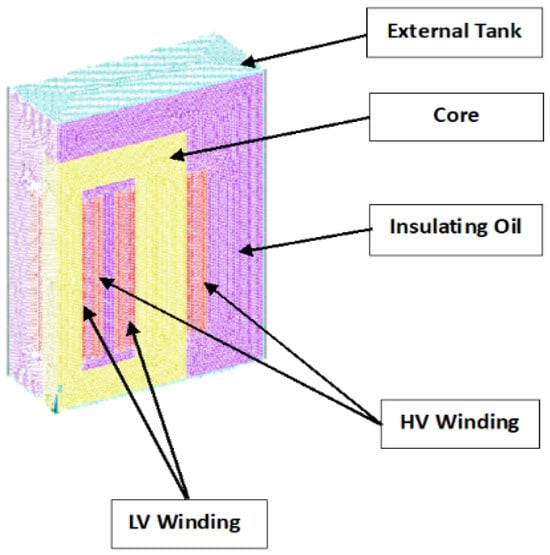 The 3D geometry of the transformer model, depicted in Figure 2, is constructed and simulated using Finite Element Method ANSYS 19 software. The outcomes were obtained by solving the governing heat transfer equation, represented below as Equation (20):