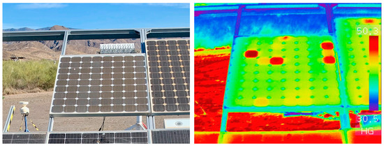 (Left): RGB image of a defective module. On the RGB image it appears clean, and a potential hot-spot is not observed. (Right): IR image of the defective module. The IR image clearly shows 4 hot cells. By having access to both the RGB and the IR images, one can conclude that the module is defective. One string, the third and fourth column from the right, is bypassed. The temperature is slightly increased compared withthe other cells (except of the hot-spots).