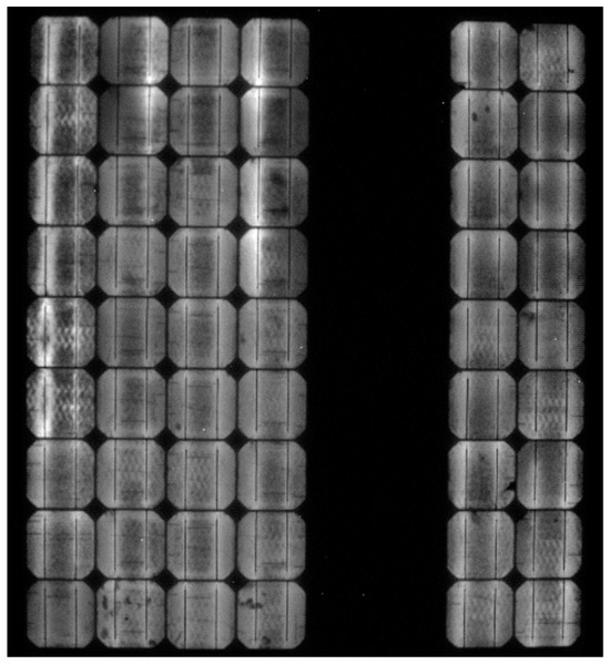 Electroluminescence image of the above-mentioned module. There are multiple cracks visible. This module is likely to show one or more hot cells when operated. One string is bypassed and therefore shows no electroluminescence signal.
