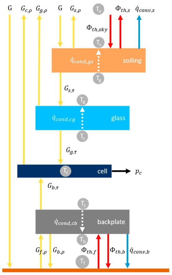 is the conductive heat transfer through the soiling layer. is the conductive heat transfer through the glass layer. is the conductive heat transfer through the back sheet. All conductive heat transfers point away from the cell. This is defined this way because the cell is the layer that absorbs the most radiation and is therefore the hottest. is the convection that takes place on the soiled surface. is the convection that takes place on the rear side of the module.