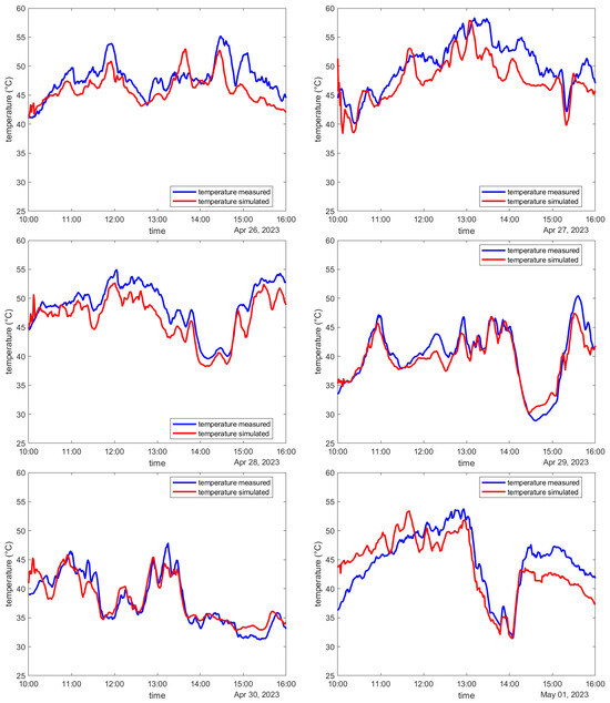 The obtained error metrics over the six days, 10:00 to 16:00 each, were an RMSE of 2.6 K, an MAE of 2.2 K, and an MBE of −1.3 K. The R2 value was 0.8677.