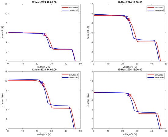 Measured and simulated IV curves. Exemplary, one day and four timestamps are chosen (12 March 2024). Upper left 10:00, upper right 12:00, lower left 14:00, and lower right 16:00. The small circles indicate the maximum point points. The electrical simulation to calculate the IV curves was performed with the Bishop model [61].