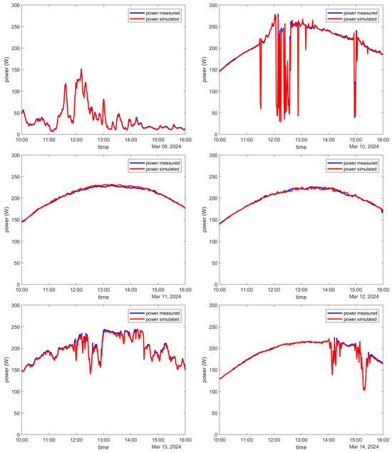 Figure 9 compares the measured and simulated IV curves. For example, only four IV curves of one day, March 12, are shown with a time difference of 2 h each. One can see that the shapes of the IV curves are qualitatively correct. There is a slight tendency to predict too high open circuit voltages and too low short-circuit currents. The IV curve with the timestamp 14:00 was impacted the most. The reason was probably related to simplifications of the underlying electrical Bishop model [61]. The position of the maximum power point was calculated relatively accurately. The height of the plateau of the current differs slightly between measurement and simulation. The reason might be that the transmittance of the artificial soiling layer slightly changed over time. As the foils used as artificial soiling heated up, they might have changed their transmittance. Figure 10 compares the measured and simulated electrical powers in a plot as a function of time. In general, the electrical power was calculated well (RMSE = 2.1 W, MBE = −0.2 W, MAE = 1.6 W). The R2 of modeling the electrical power was 0.9991. On average, the relative deviation between the predicted and measured power was 1.37%. One subfigure corresponded to each day, starting in the upper left with the 9th of March and continuing to the 14th of March in the lower right.