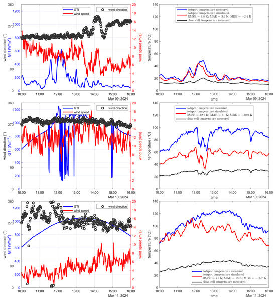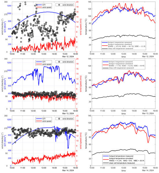 The right side of Figure 11 compares the measured and simulated hot-spot temperatures and the measured temperature of a clean cell. Each day is discussed individually. To explain and understand the features that occur one must have a look at the GTI, the wind speed, and the wind direction which are shown also in Figure 11, but on the left side each. On the 9 March, the temperature was simulated well with an RMSE of 4.8 K. This was a day with a low GTI and strong wind from the southwest direction. For the 10 March, the model predicted a hot-spot with temperatures about 20 K above those of the clean cells but underestimated the temperature significantly by more than 30 K resulting in an RMSE of 32.7 K and an MBE of −30.9 K. On that day, the GTI was generally pretty high and there was strong wind from the west direction. In this context, a high GTI referred to the GTI reaching about 1000 W/m2 at solar noon and, overall, only a few clouds over the day. On the 11 March, the temperature estimation was good for the first two hours of the analyzed time interval. Afterwards, the temperature was underestimated similarly to the 10 March resulting in an RMSE of 21 K and an MBE of −16.7 K. On the 11 March, the GTI was high and the wind from the west direction grew continuously stronger over the day. On the 12th the temperature was estimated well. In the morning the temperature was overestimated slightly while it is underestimated slightly in the afternoon, resulting in an RMSE of 12.5 K and an MBE of 1.5 K. In the morning there was basically no wind, and in the afternoon there was a slight wind coming from the west direction. The GTI was high. On the 13th the temperature was calculated overall accurately with an RMSE of 7.7 K and an MBE of 0.9 K. The GTI was high and there was a wind of about 5 m/s from the east direction. On the 14th of March, the temperature was, generally speaking, slightly underestimated with an RMSE of 11.2 K and an MBE of −6.6 K. The GTI was high and there was a small but continuously increasing wind from the west direction. Over six days, the model performed with an RMSE of 17.7 K, an MAE of 13.1 K, and an MBE of −9.0 K. The model achieved an R2 of 0.7712 and the hot-spot temperature increase compared with the clean cell was on average calculated with a deviation of 25.8%.