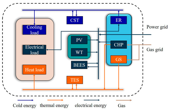 Thermal energy is primarily generated by the CHP and GB units, which convert natural gas into heat. This heat is transported to the thermal energy bus, where the optimal scheduling of thermal energy storage tanks (TES) ensures an effective balancing of local thermal loads. Cold energy is primarily supplied through ER systems, which are connected to the electrical bus. These systems convert electricity into cold energy, which is stored in cold energy storage tanks (CST) and distributed via the cold energy bus to meet local cooling demands. When local energy resources exceed demand, energy can be stored using ER and CST to enhance overall energy utilization [17,18,19,20].