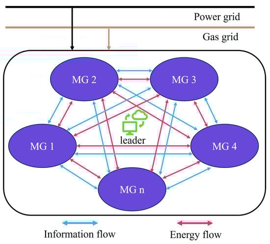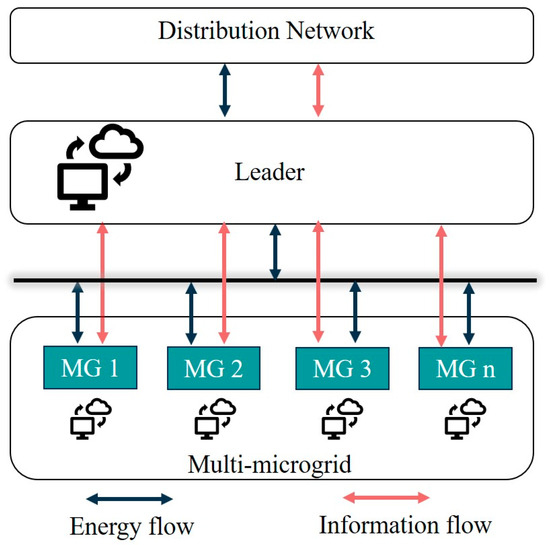 As shown in Figure 2, within the MMG centralized operation framework, the upper-level leader acts as an intermediary for multiple microgrids in conducting transactions with the distribution grid. There is no direct interconnection between the microgrids for energy or data exchange, so transactions between microgrids must occur indirectly through the leader. Each microgrid maintains an independent energy management system (EMS) to optimize local loads and calculate energy surpluses or deficits, which are then communicated to the upper-level EMS. The upper-level leader consolidates the energy surpluses and deficits of all microgrids via the energy bus and coordinates and optimizes them to ensure power balance. If the user group cannot achieve energy self-balancing, it must purchase or sell energy from the distribution grid to maintain balance on the bus. In this structure, the leader, acting as an energy hub, typically possesses energy regulation capabilities, such as energy storage and conversion devices, enabling the joint scheduling of multiple microgrids. The benefits of this framework include its structural simplicity and increased grid stability, though it also results in the greater dependency of each microgrid on the operator and lower interaction efficiency [21,22].
