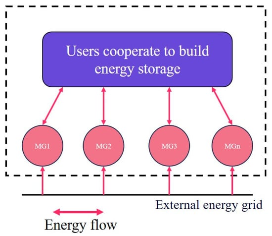 In recent years, amidst the booming development of the sharing economy, shared energy storage, as an emerging energy management model, has garnered increasing attention. Its core concept lies in connecting multiple users to a centralized energy storage system, thereby realizing energy sharing and optimized scheduling within a regional scope [33]. Shared energy storage not only enables the storage of surplus renewable energy generated by users, enhancing the utilization rate of renewable energy, but also allows for the storage of low-cost power during off-peak hours and its subsequent release during peak hours, achieving peak shaving and valley filling while simultaneously reaping economic benefits. More importantly, this model contributes to breaking down the isolation of traditional household energy storage, fostering greater coordination in energy use and enhancing overall efficiency [34]. In MMG systems, individual microgrids may possess varying electricity loads, renewable energy generation capacities, and electricity pricing strategies. Shared energy storage can function as a “regulator”, connecting multiple microgrids and enabling better collaborative optimization and resource scheduling [35].