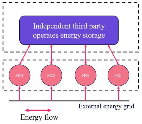 In the model illustrated in Figure 5, a third party independently invests in shared energy storage and connects all microgrid users in the region. In this model, the shared energy storage operator provides services to each user through energy trading and capacity leasing to generate profits. Ref. [41] presents a personalized pricing strategy tailored to the price sensitivity of users, which can significantly increase energy storage utilization and reduce costs for users. In the integrated energy microgrid scenario, Ref. [42] proposes a multi-energy coupled shared energy storage plant established by an operator, offering storage capacity leasing services for power, cooling, and heat to microgrid users. This approach facilitates multi-energy interactions among microgrids and prevents individual microgrid users from having to build separate energy storage systems, thus reducing overall system operating costs. In terms of operators’ business strategies, Ref. [43] proposes a credit-based energy storage sharing model. This model adopts a cost-based capacity sharing pricing strategy when the user’s credit is positive and switches to a demand-based energy sharing pricing strategy when the user’s credit is negative. This hybrid strategy effectively increases the net profit of shared energy storage operators.