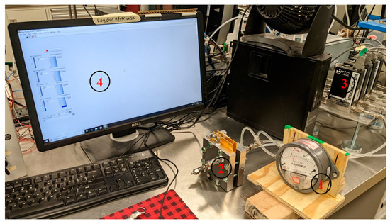 Experimental set-up (1. differential pressure gauge, 2. fuel cell fixture, 3. mass flow controller, 4. display of lab view).