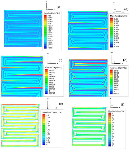 GDL (Z-direction) and channel mass flux (in XY-plane) contours for the 4-channel serpentine flow field: GDL mass flux on a wide scale ((a) low flow and (d) high flow condition), GDL mass flux on a concise scale ((b) low flow and (e) high flow condition), and channel mass flux ((c) low flow and (f) high flow condition).