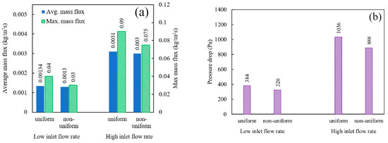 Comparison of the average and maximum GDL mass flux, along with the overall pressure drop between the uniform and non-uniform hybrid designs: (a) Mass flux, (b) pressure drop.