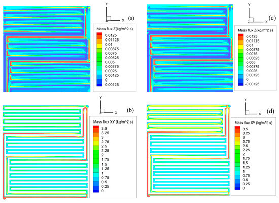 Comparison of the GDL (Z-direction) and channel mass flux (in the XY-plane) between the uniform and non-uniform hybrid designs at the low inlet flow rate condition: Uniform hybrid ((a) GDL mass flux, (b) channel mass flux) and non-uniform hybrid ((c) GDL mass flux, (d) channel mass flux).