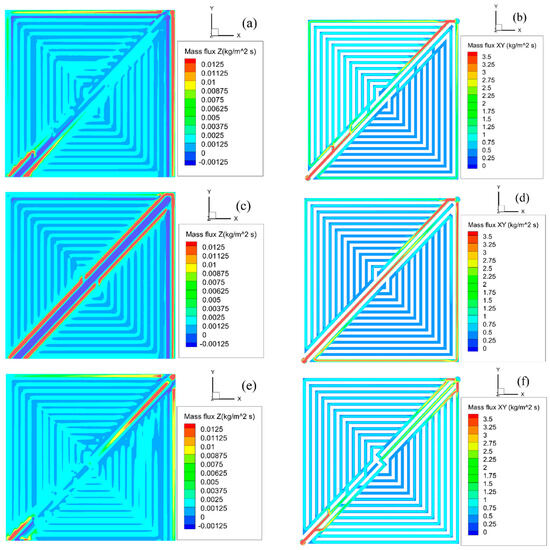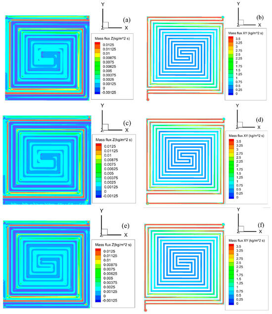 GDL (Z-direction) and channel (in XY-plane) mass flux contours for different spiral designs at low inlet flow rate: Design-1 ((a) GDL mass flux, (b) channel mass flux), design-2 ((c) GDL mass flux, (d) channel mass flux), and design-3 ((e) GDL mass flux, (f) channel mass flux).