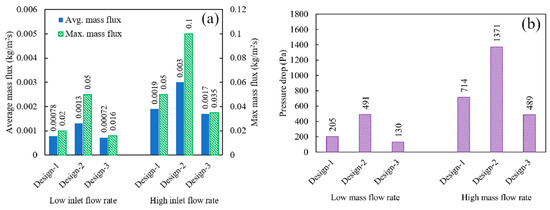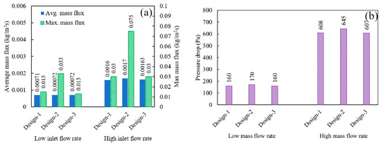 Figure 12 shows the comparison of average and maximum mass flux through the GDL, along with the overall pressure drop, of the dual-triangle sandwich flow field designs. As shown by Figure 12a, at low and high inlet flow conditions, design-2 exhibits a higher average and maximum mass flux compared to the other designs. These higher average and maximum mass flux values are due to the presence of dead ends in the diagonal trunk channel of design-2 (Figure 1h), which forces the air to flow through the GDL. Design-3 has the lowest average and maximum mass flux. This indicates that the modification of side channel connections to the outlet trunk in design-3 (Figure 1i) reduces the air flow through the GDL. However, these mass fluxes are just slightly lower than the values provided by design-1. Positively, design-3 exhibits the smallest difference between the average and maximum GDL mass flux (difference at 400 SCCM: 0.015 kg/m2·s, 900 SCCM: 0.033 kg/m2·s). The differences for design-1 (difference at 400 SCCM: 0.019 kg/m2·s, 900 SCCM: 0.048 kg/m2·s) and design-2 (difference at 400 SCCM: 0.049 kg/m2·s, 900 SCCM: 0.097 kg/m2·s) are greater. This low difference indicates a greater uniformity in GDL mass flux. For all three dual-triangle sandwich designs, the difference increases as the inlet flow rate is increased from 400 to 900 SCCM, indicating a decrease in uniformity in GDL mass flux distribution with an increase in inlet flow rate. Looking at the pressure drop chart in Figure 12b, the pressure drop through the flow field in design-2 is ~2 and ~3.5 times higher compared to design-1 and design-3, respectively, which is due to the presence of a dead end in the upper and lower triangle and the lack of a connection from the triangles to outlet channel. Design-3 yields the lowest pressure drop among all the designs. The modification of the base design (design-1) to design-3 causes a decrease in pressure drop by ~36% and ~32% at low and high flow rate conditions, respectively.