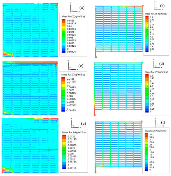 Comparison between various dual-triangle sandwich designs in terms of the GDL (Z-direction) and channel (in the XY-plane) mass flux at the low inlet flow rate condition: Design-1 ((a) GDL mass flux, (b) channel mass flux), design-2 ((c) GDL mass flux, (d) channel mass flux), and design-3 ((e) GDL mass flux, (f) channel mass flux).