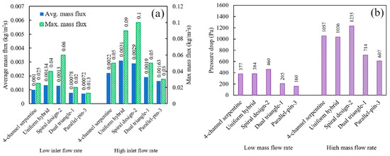 Comparison of average and maximum GDL mass flux, along with the overall pressure drop, among various 2-channel spiral designs: (a) Mass flux, (b) pressure drop.
