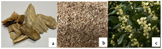 (a) Acacia wood chips, (b) shredded acacia wood chips, and (c) Acacia melanoxylon tree.