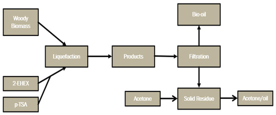 The procedure was performed at 160 °C during 90 min with a feed ratio between biomass and solvent (B:S) of 1:5, 2-EHEX was used as the solvent, and the catalyst (pTSA) mass was fed as 3% (m/m) of overall mass, and the feedstock used were standard wood chips. A process map describing the liquefaction process is shown in Figure 2.