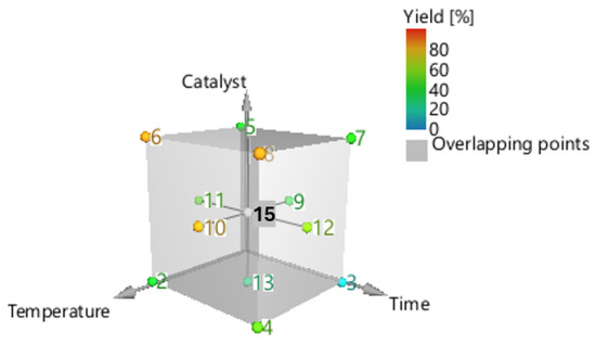 This paper aims to conduct a more systematic analysis using an RSM experiment to explore the effects and interactions of the three key and independent experimental variables, such as reaction temperature (x1), reaction time (x2), and catalyst concentration (x3). The factorial design applied was a central composite face-centred (CCF) design (Figure 3). The design included three duplicates of the cube’s central point (0,0,0), one experiment for each cube’s vertices (factorial points), face-centred (axial points), and a total of 17 experimental sites. The three variables—temperature, duration time, and catalyst concentration—were coded and varied from 100 to 170 °C, 30 to 200 min, and 0.5 to 10% w/w, respectively. The response of the conversion (Y, %), which is a function of these three parameters, is given by Equation (5), as follows [24]: