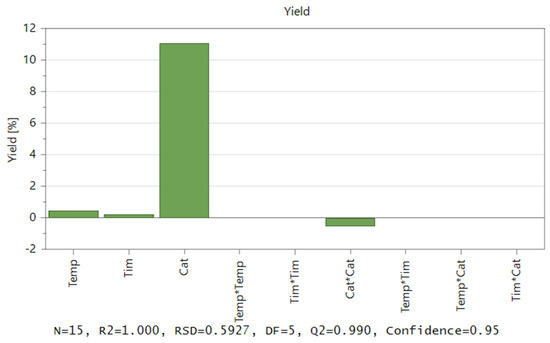 Software MODDE 12.1 Pro® was applied to develop an experimental matrix, and the central composite face-centred (CCF) design was selected. First, the effects of three variables (T, cat, and time), the second-order effects, and the interactions between the two variables (T*T), (cat*cat), (time*time), (T*cat), (T*time), and (time*cat) were estimated. Figure 4 exhibits both the correlation coefficient and the model’s coefficient plot. The effect of each variable measures the influence of its variation on the response. It should also be noted that catalyst concentration has the greatest influence on yield, whereas reaction time has a minimal impact on yield.