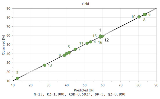 Variance analysis (ANOVA) was used to evaluate the model fit and to compare it to pure error. where Y1 corresponds to yield, X1 to the temperature, X2 to the duration time, and X3 to the catalyst concentration.