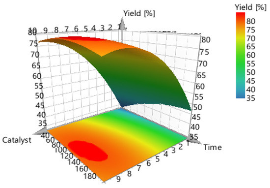 Figure 7 shows the model’s contour plot, which demonstrates that catalyst concentration is the most crucial element. In fact, if the catalyst concentration is used at the highest level (10%) and the highest temperature (170 °C), conversions exceeding 80% can be accomplished using a short reaction time (30 min).