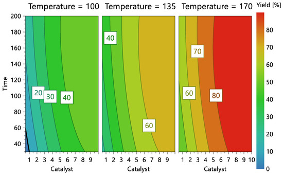 Reaction contour plots according to temperature levels, catalyst concentration, and reaction time.