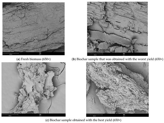 SEM micrograph of (a) the fresh biomass (650×), (b) the sample that was obtained with the worst yield (650×), and (c) the biochar sample that was obtained with the best yield (650×).
