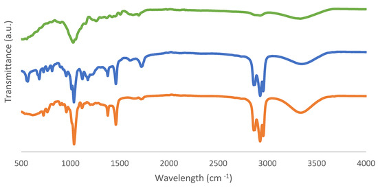 The FTIR-ATR analysis was carried out with a Spectrum Two-Perkin Elmer (Waltham, MA, USA) apparatus. Spectra were collected between 600 and 4000 cm−1 wavenumbers using Perkin Elmer-Spectrum 10 IR software to determine the standard fingerprint region of the lignocellulosic material.
