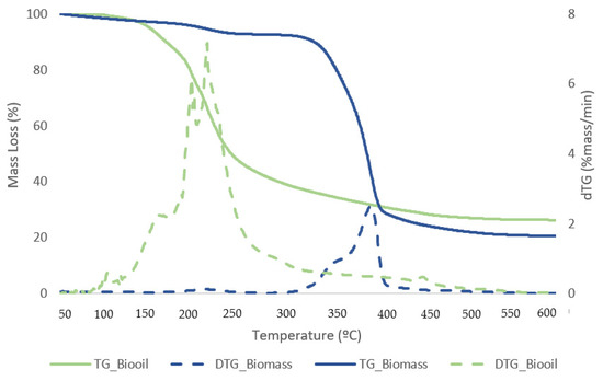 TG (solid lines) and DTG (dashed lines) curves for biomass and dried bio-oil samples with the best conversion.