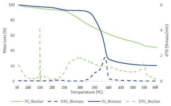 TG (solid lines) and DTG (dashed lines) curves for biomass and biochar samples with the best conversion.