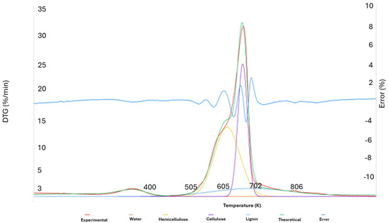 Using DTG, a multi-component model was applied to determine the sample’s composition, admitting the presence of four main groups: water, hemicellulose, cellulose, and lignin. Each of these groups contributes to the experimental curve, and it is possible to recreate a “theoretical” curve by adding the four different curves that each group’s rate of volatilization at various temperatures represents. The Solver tool in Microsoft Excel is used to create this theoretical curve, which closely resembles the experimental curve. To minimize the deviations, symmetric Gaussian-type curves are adjusted by modifying three parameters for each region’s curve: α, amplitude; b, position; and c, width at half height [35].