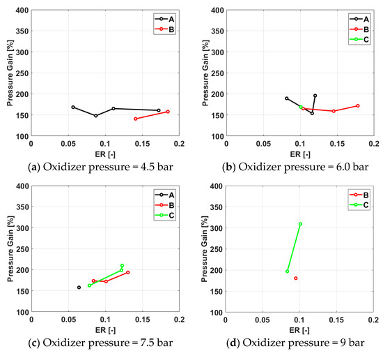At low oxidizer pressure (4.5 bar), injector Type A maintains a relatively stable pressure gain. Although injector Type B shows lower values initially, it demonstrates an upward trend as the ER increases. This indicates that as more fuel becomes available, the performance of Type B improves, likely due to better fuel–oxidant mixing at higher ERs.