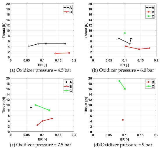 At low oxidizer pressures (4.5 bar), thrust values exhibit minimal variation with ER. Injector Type A emerges as the optimal choice across ERs, with values around 5 N, except for the lowest tested ER. Injector Type B displays smaller but stable values, around 1.5 N. This suggests that, for lower oxidizer pressures, a smaller fuel injector opening is more effective at being entrained in the vortex and generates better mixing.