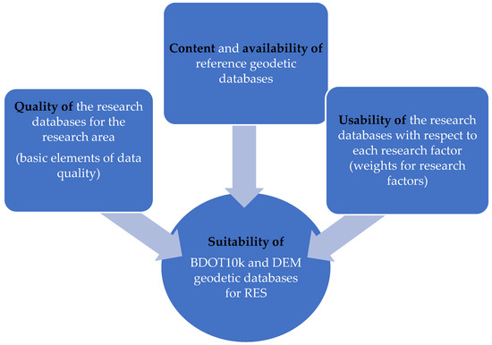 This study introduces the concept of database suitability and attempts to identify aspects influencing it. Database suitability is intrinsically linked to the quality of data within the databases, which is referred to as external quality. As defined by [45], external quality encompasses all characteristics of a product that affect its ability to satisfy both explicit and implicit needs. According to [35], data are deemed high-quality if they are usable for operational, decision-making, and planning purposes. The data can be used as intended if they are free of defects and have the desired characteristics. Essential attributes of high-quality data include availability, completeness, consistency, accuracy, and usability. Since geodetic databases are information products, evaluating their usability—the aspect that determines how well a product meets user requirements—is essential [46]. Usability is a concept commonly applied in informatics to interactive devices, applications, and websites. According to the standard [47], usability assesses the performance, efficiency, and satisfaction derived from using a product by particular users for specific tasks under defined conditions. The figure below (Figure 1) shows the most important aspects that determine the usability of a spatial database for the user. These will include not only the quality of the data contained in the database, but also the availability and type of data (format, content) and usability in terms of user-defined factors.